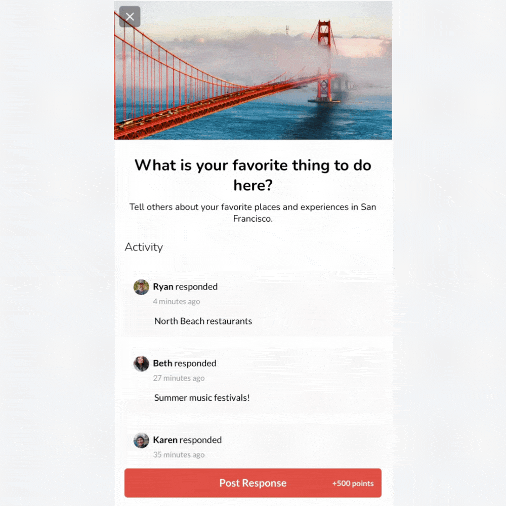 The new Q&A activity lets you prompt participants to answer a question as part of an experience-perfect for education, storytelling, feedback, or lightweight surveys. And just like other activities, you can award points (and drive progress toward rewards) for responding, turning learning and input into real engagement.