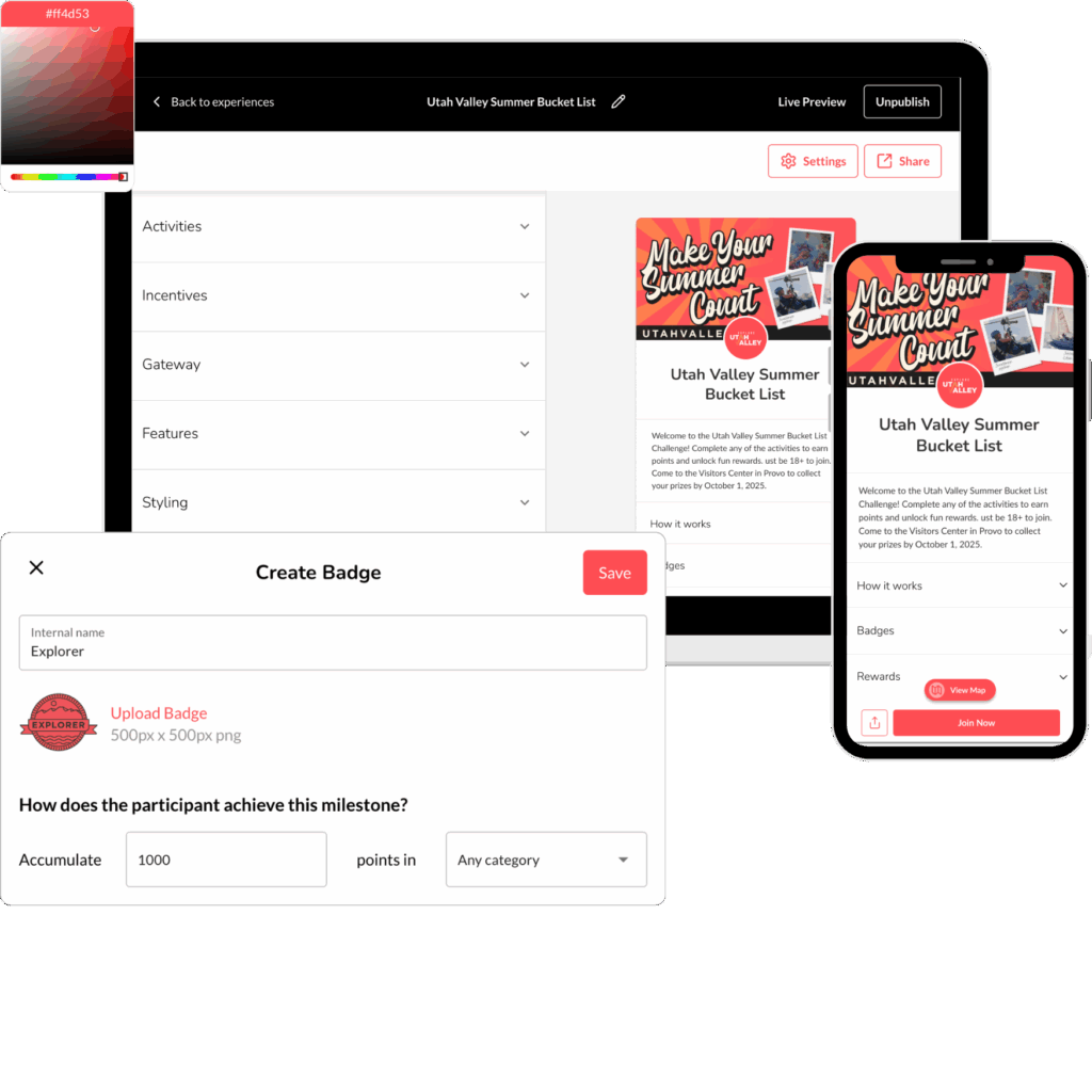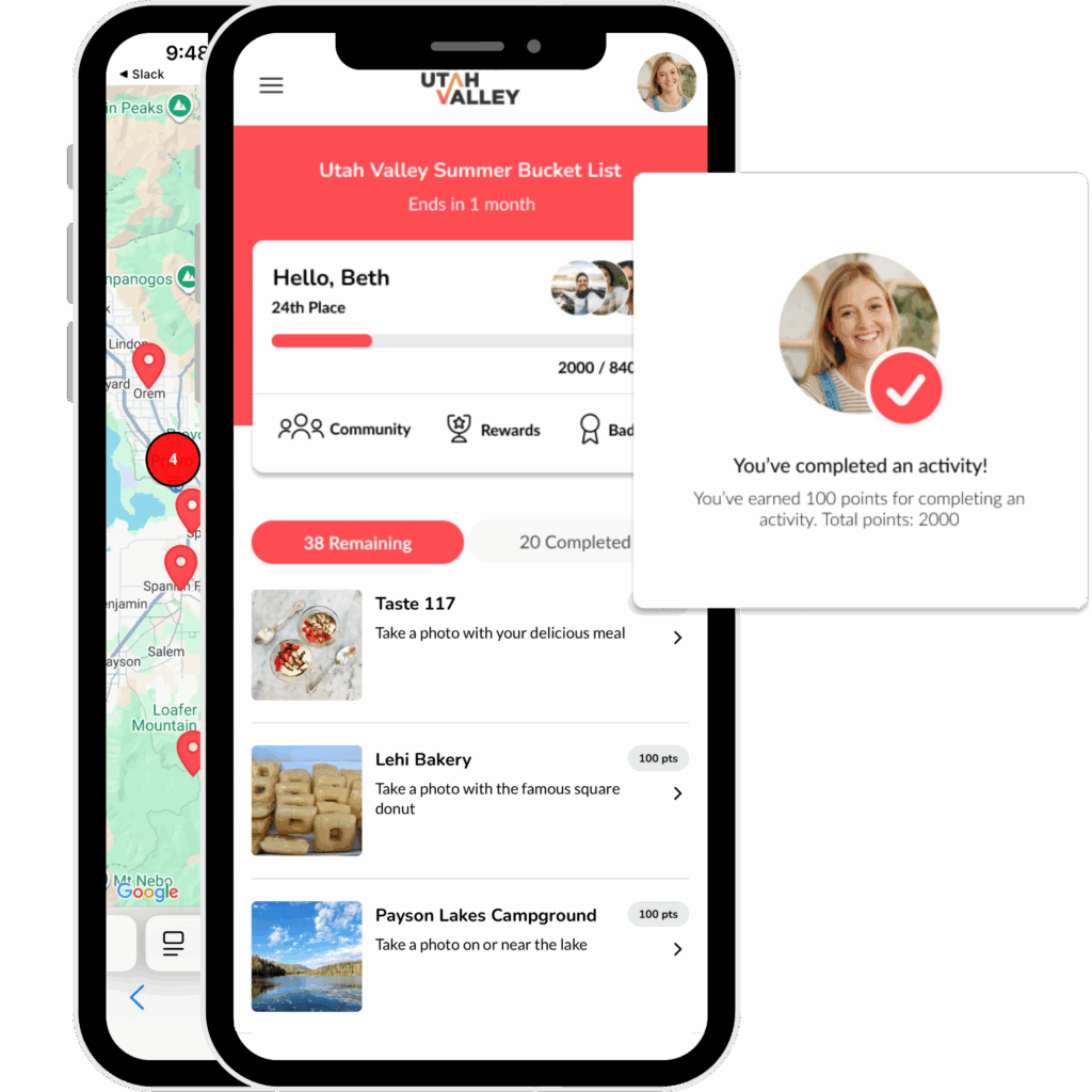 With the no-code Experience Builder, organizations design interactive challenges where participants complete activities—like checking in at locations, scanning QR codes, submitting photos, or visiting places—to earn rewards, badges, and prizes. Participants simply join from their mobile device, explore a list of activities, and track their progress through a personalized experience.